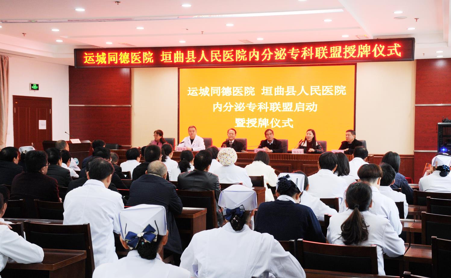 为进一步加强全市内分泌学科规范诊疗能力、实现优质医疗资源共享,运城市正在推进由同德医院牵头成立的内分泌专科联盟建设。2019年11月26日一大早,院长路文盛、常务副院长师布朵、血液透析科主任范维、健康管理中心主任兼门诊部主任王晓丹一行四人从盐湖区驱车一个多小时来到舜帝故里、因发现“世纪曙猿”化石而被学术界公认为人类起源地的垣曲县城。美丽的垣曲由太行山、王屋山和中条山三山环抱,黄河由南界流过,风光旖旎、民风淳朴。因地处晋南边陲,医疗资源相对匮乏。今天,运城同德医院代表运城市内分泌专科联盟亲赴垣曲县人民医院授牌,以示对垣曲医疗卫生事业的鼎力支持。授牌仪式在医院会议室隆重举行,医院员工和医疗集团相关卫生院院长近百人参加了本次会议。
