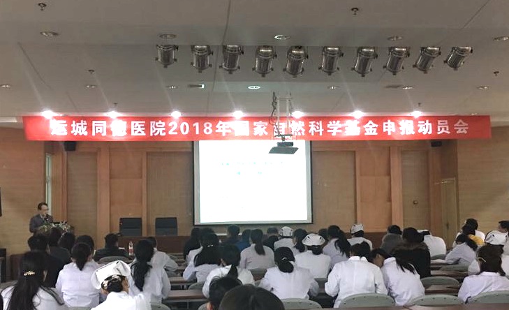 2017年11月27日, 2018年度国家自然科学基金申报动员会在运城同德医院召开。会议特邀国家自然科学基金终审大评专家、中国老年学学会老年医学委员会主委、中国医师协会老年医学医师分会副会长黎健教授,广西自治区人民医院教学部部长蒿艳蓉博士做专题辅导,运城同德医院院长路文盛博士主持会议并结合自己两次中标国家自然科学基金情况做了精彩报告。运城同德医院业务院长、首席主任医师潘莉华做大会总结并鼓励我市医学科研人员积极申报。市直各医疗机构科研工作者及我院医护人员近200余人参加动员大会。