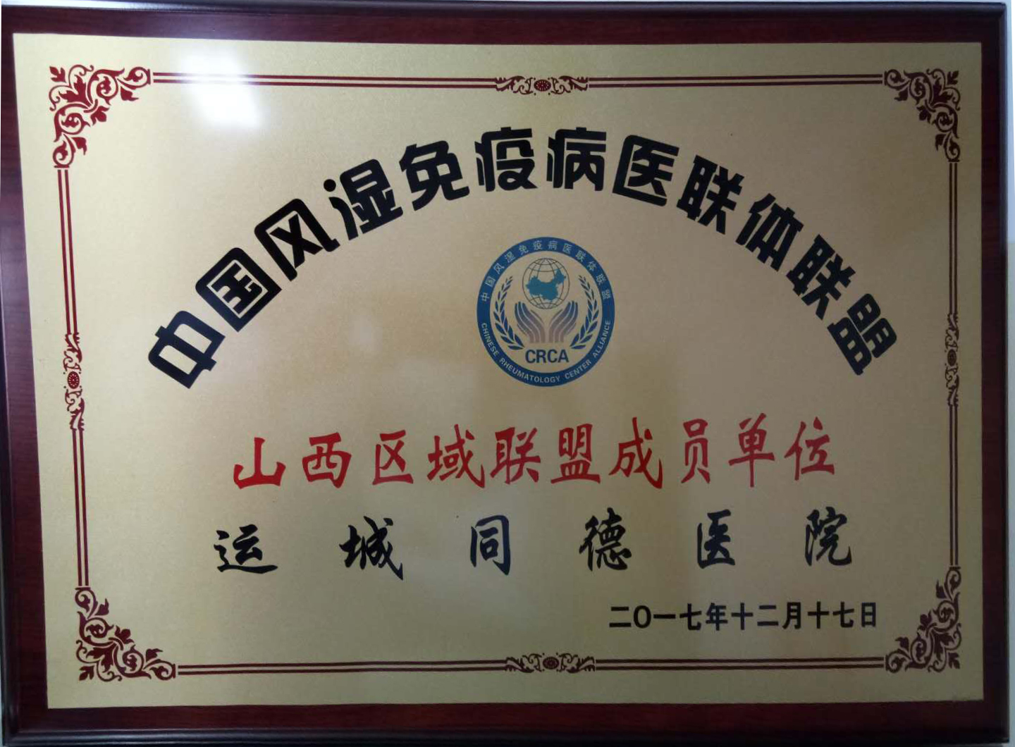 中国风湿免疫病医联体联盟山西区域联盟成立大会,在2017年12月15日至17日召开的山西省第十五届风湿病学学术年会上举行,运城同德医院荣获中国风湿免疫病医联体联盟山西区域联盟成员单位,我院风湿免疫科主任、主任医师李春萍当选中国风湿免疫病医联体联盟山西区域联盟副理事长。新成立的中国风湿免疫病医联体联盟山西区域联盟,旨在带领全省从事风湿免疫病防治及相关疾病工作的医疗机构、社会组织、产学研单位共同促进风湿病学的发展,提高基层服务能力,推进分级诊疗。以不同形式如与联盟单位远程视频会诊、定期培训医师、派医师赴联盟单位帮扶等,解决风湿免疫病患者看病就医问题,满足广大人民群众看病就医需求。在16日召开的学术研讨会上,李春萍主任受邀做了《缄默无言(盐)的类风湿关节炎》,得到与会专家的广泛好评。