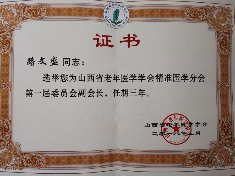 路文盛院长当选山西省老年医学会精准医学分会副会长