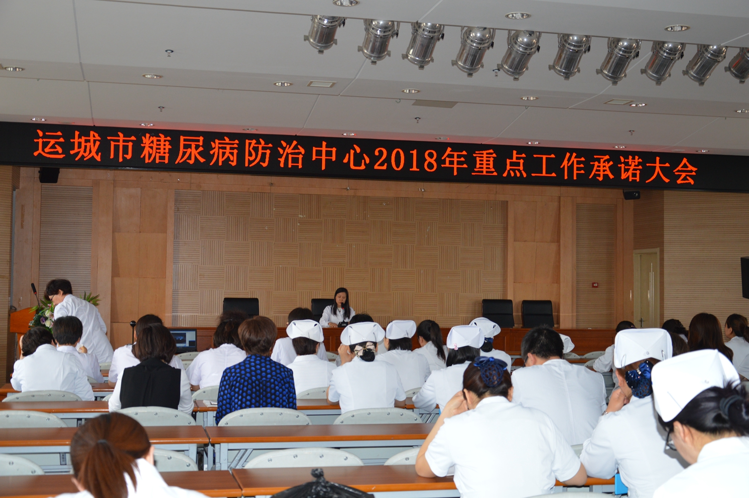 2018年5月9日,运城市糖尿病防治中心隆重召开2018年重点工作承诺大会, 18名临床和医技科室主任登台亮相,郑重承诺。路文盛主任强调,要抓住研诺、亮诺、践诺、兑诺四个环节引深承诺工作,重点加强核心技术、教学科研、服务文化、质量安全和学科建设,提高服务能力,确保医疗安全,共同为全市的糖尿病防治工作做贡献。