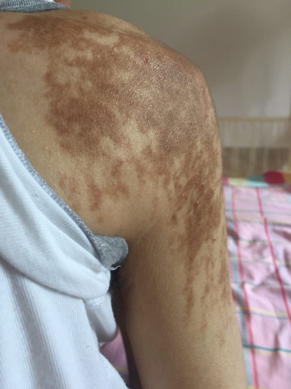 查体:血压96/78mmHg、身高152cm、体重40.7kg、体重指数 17.61kg/m2。面容异常,右侧肩部有片状咖啡-巧克力色样皮肤色素沉着(出生时就有),四肢变形,右下肢缩短畸形。