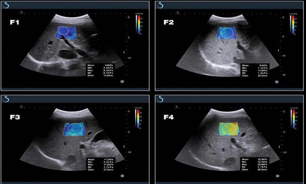 ▲肝纤维化 F1-F4 期的 E 成像图像和测量数据:随肝纤维化程度的不断加重,E 成像 颜色由深蓝-亮蓝-绿- 黄,杨氏模量值也不断升高。