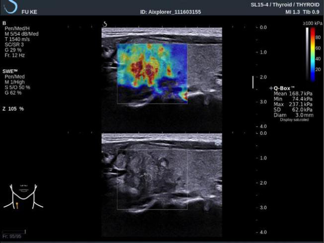 ▲甲状腺乳头状癌:E 成像显示结节内部硬度明显增高达到 237.1kPa,且软硬不均。