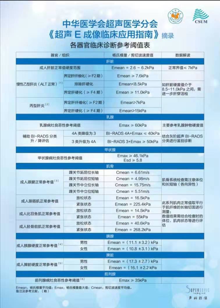 E超在各个学科已有广泛应用,经过大样本多中心研究,在乳腺、甲状腺、肝脏、肾脏、前列腺、肌骨等系统已制定出临床应用指南。例如肝纤维化精确定量分期,占位性病变的鉴定别诊断和治疗评价,肌骨系统的功能性定量评估等。