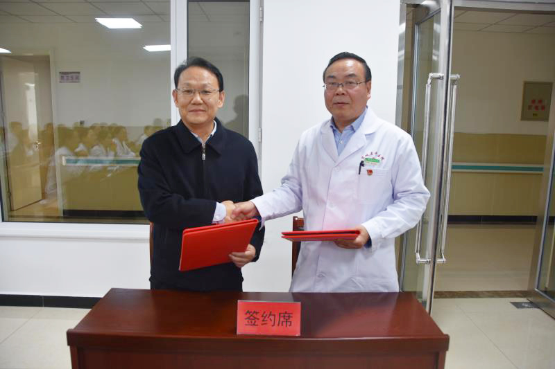 议程第四项路院长与芮城县中医院院长李小进共同签署内分泌专科联盟协议,并和芮城县委组织部部长杨建庭共同揭牌。