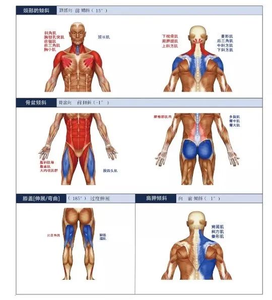 l 头部倾斜 l 高低肩 l 骨盆 l Q角 l 肩胛骨综合征 l 躯干倾斜 l 龟颈综合征 l 胸椎后凸 l 腰椎后凸 l 膝关节屈曲 / 过伸